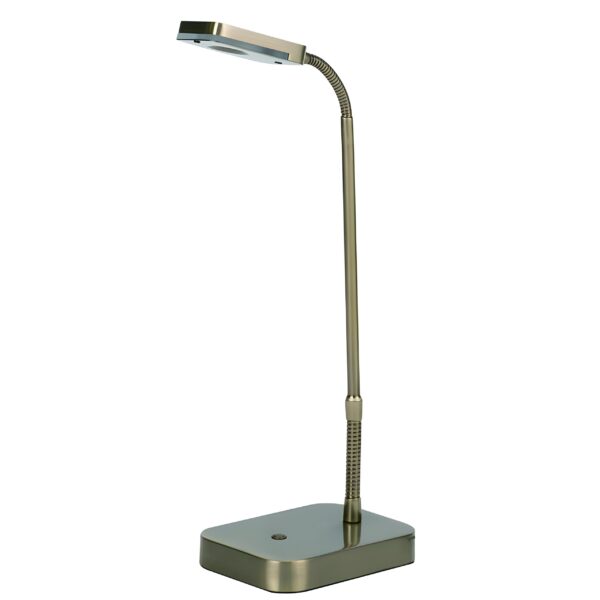 This task lamp features an 8w dimmable LED light and dual adjustable neck, finished in antique brass.