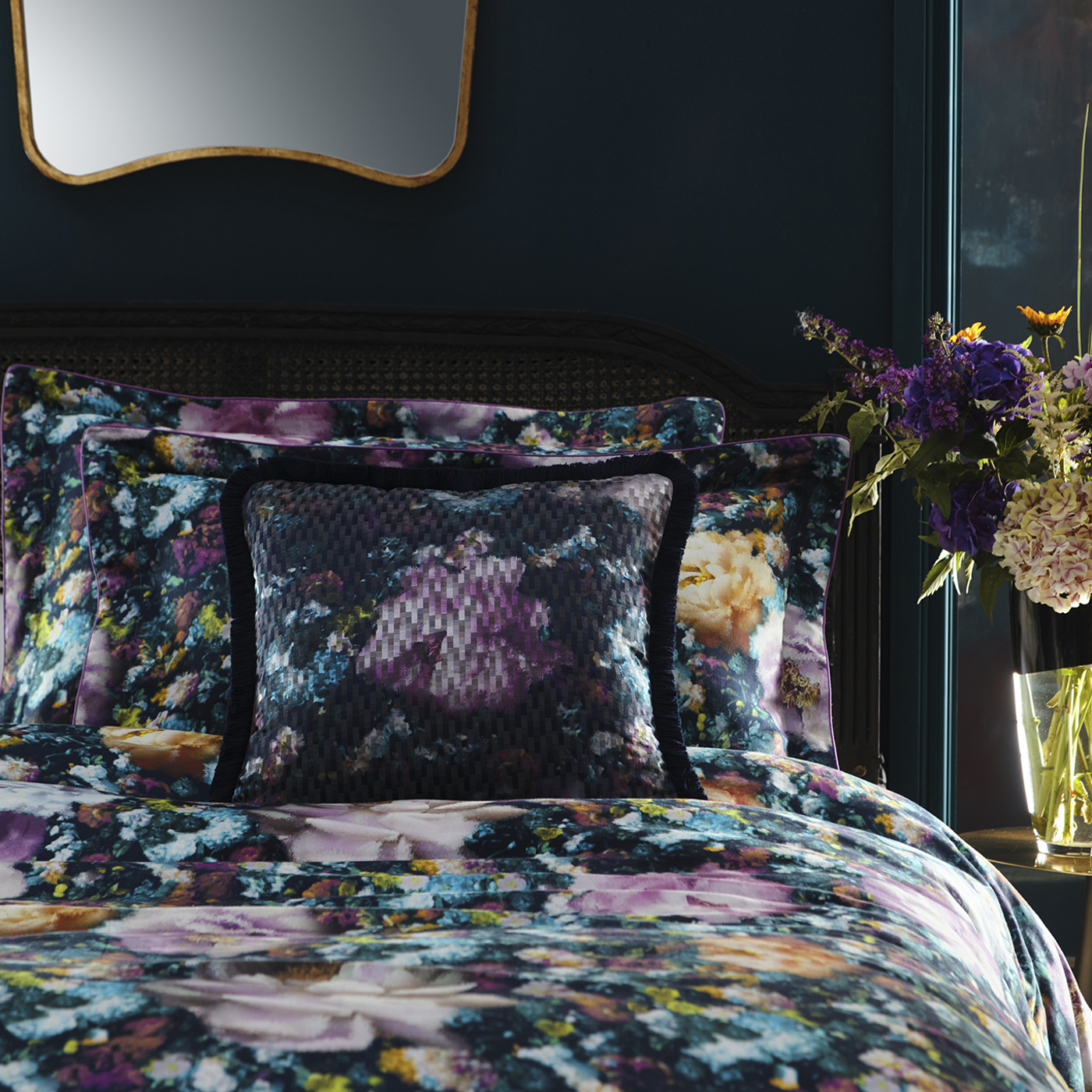 A Camile Cushion in colour Midnight by Clarke and Clarke, M2295/01. Featuring an abstract floral design of vibrant flowers with a layer of patches giving this design more character and atmosphere. The cushion also has a fringe edge for more texture and a cushion inner included.