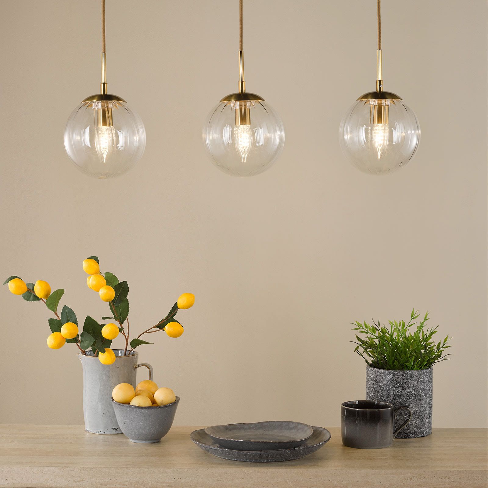 This elegant 3 light bar pendant light in natural brass with blown glass globes combines warm antique brass with three beautifully blown glass globes, bringing timeless elegance and modern simplicity to interiors. Each globe diffuses a soft, inviting glow, making it perfect for dining rooms, kitchen islands, living rooms or home offices. Carefully crafted for a high-quality finish, the globes reflect light with depth and warmth while the slim bar design adds balance without overpowering the space. A sophisticated choice for layering light, this bar pendant coordinates seamlessly with the full collection.