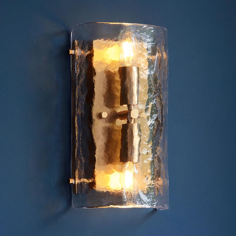 Striking and sculptural, handmade textured glass 2 light wall light with aged brass frame showcases a curved panel of handmade textured glass, designed to softly diffuse light while adding dramatic depth and elegance. The artisanal glass captures and reflects the glow from within, creating a warm, ambient effect. Finished with discreet metal fixings, this piece is perfect for hallways, living rooms, or bedrooms seeking a refined timeless touch.