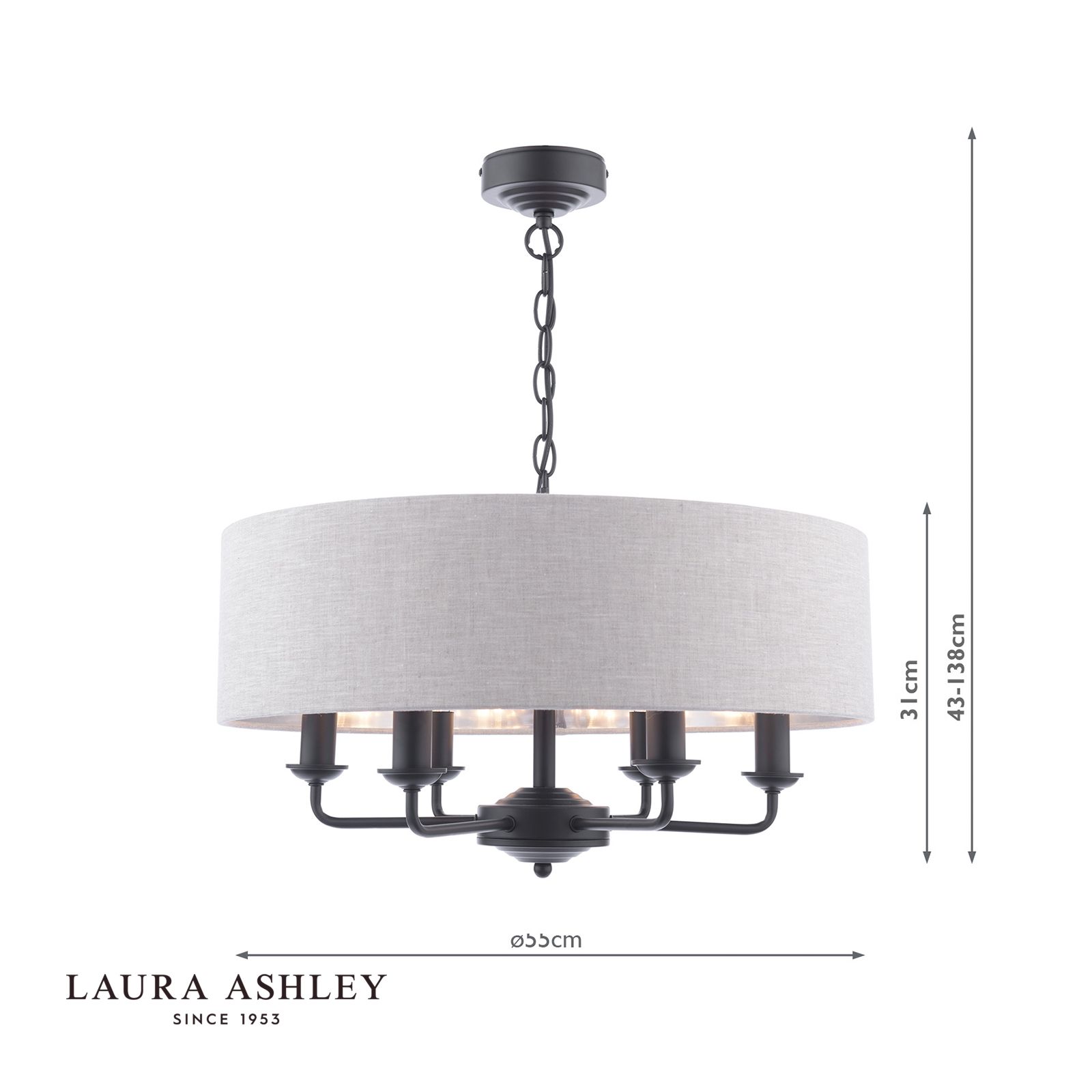 This chic Laura Ashley Sorrento Ceiling Light features six lights encased in a single contemporary drum shade in a natural slubbed linen with a metallic silver inner. The six light ceiling pendant comes in a painted black finish, adding a sophisticated atmosphere to your dining or living area.