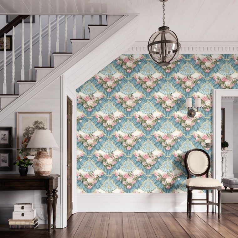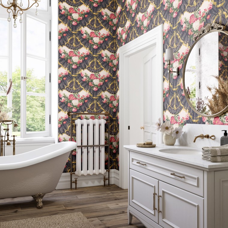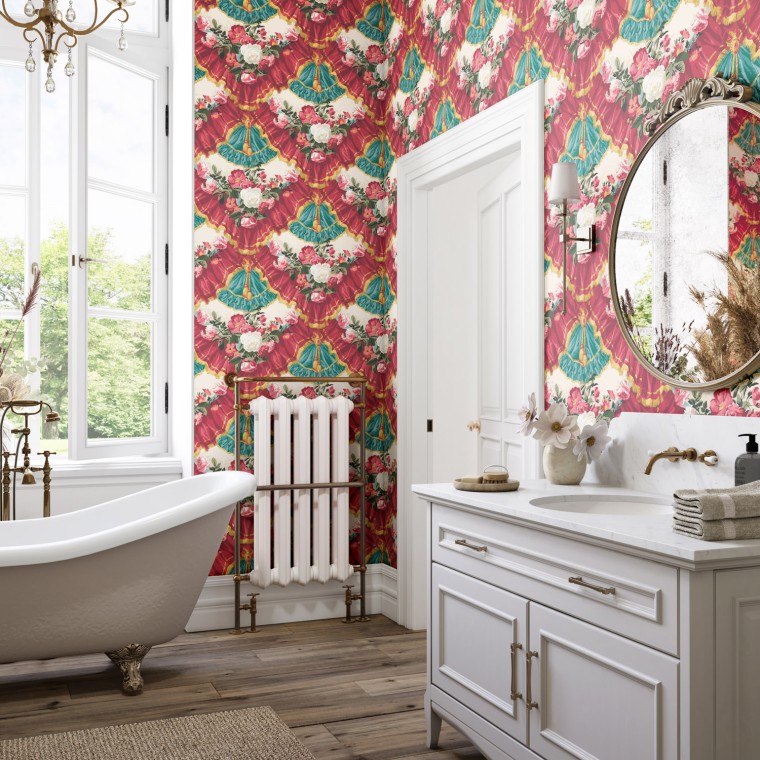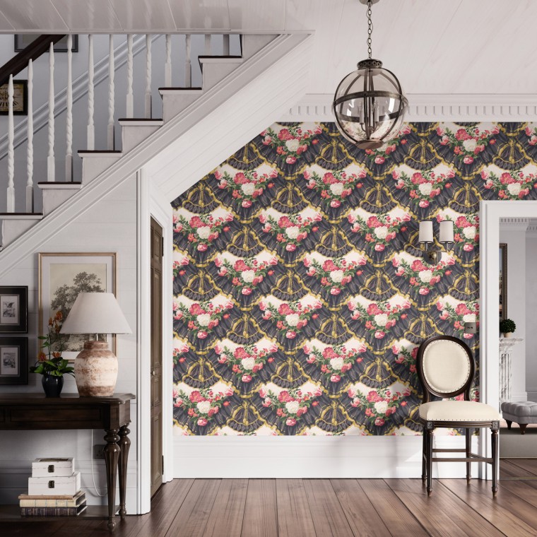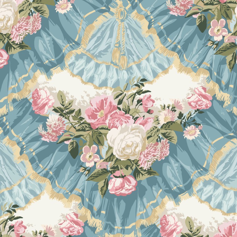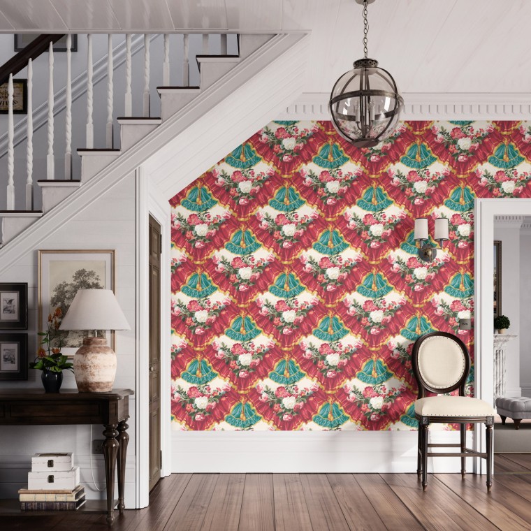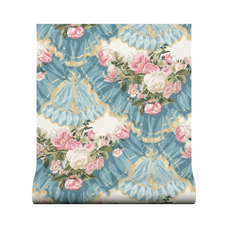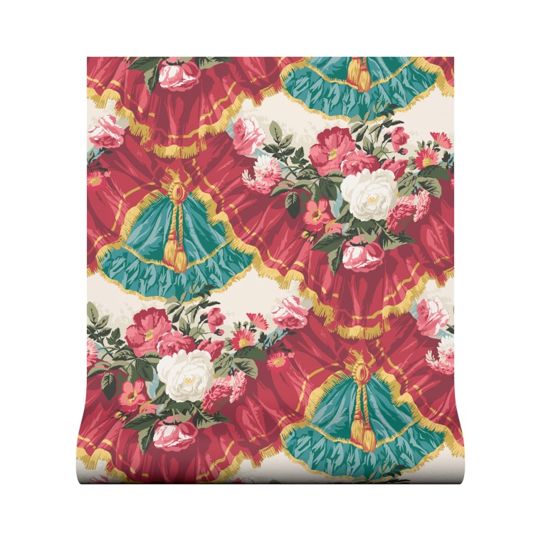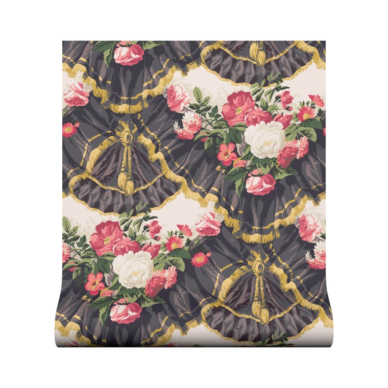 Depicting floral garlands set within a scene of gathered drapes and lavish trimmings, this bold trompe l’oeil wallpaper design was popular during the French 1870-1890 Era. This striking print is available in three colourways.
