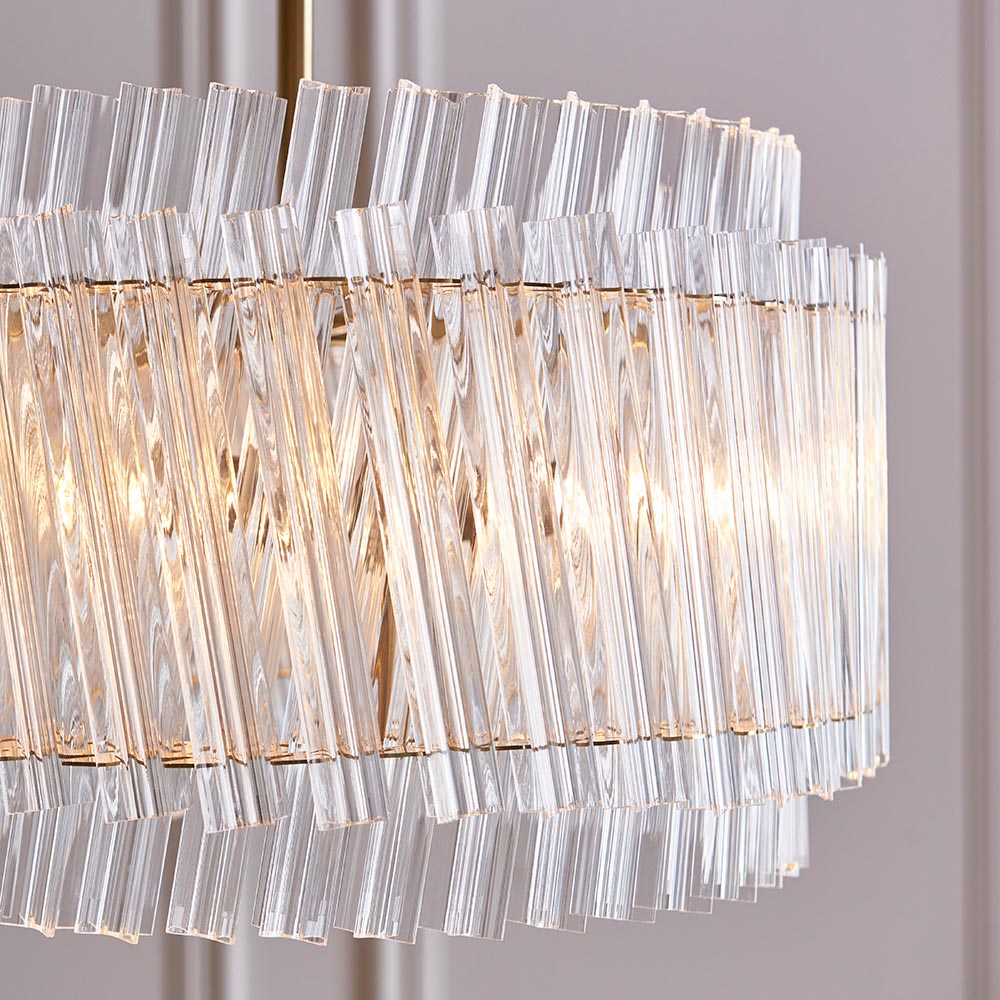 Luxury double layered clear glass rod 3 light ceiling pendant in brushed aged brass.