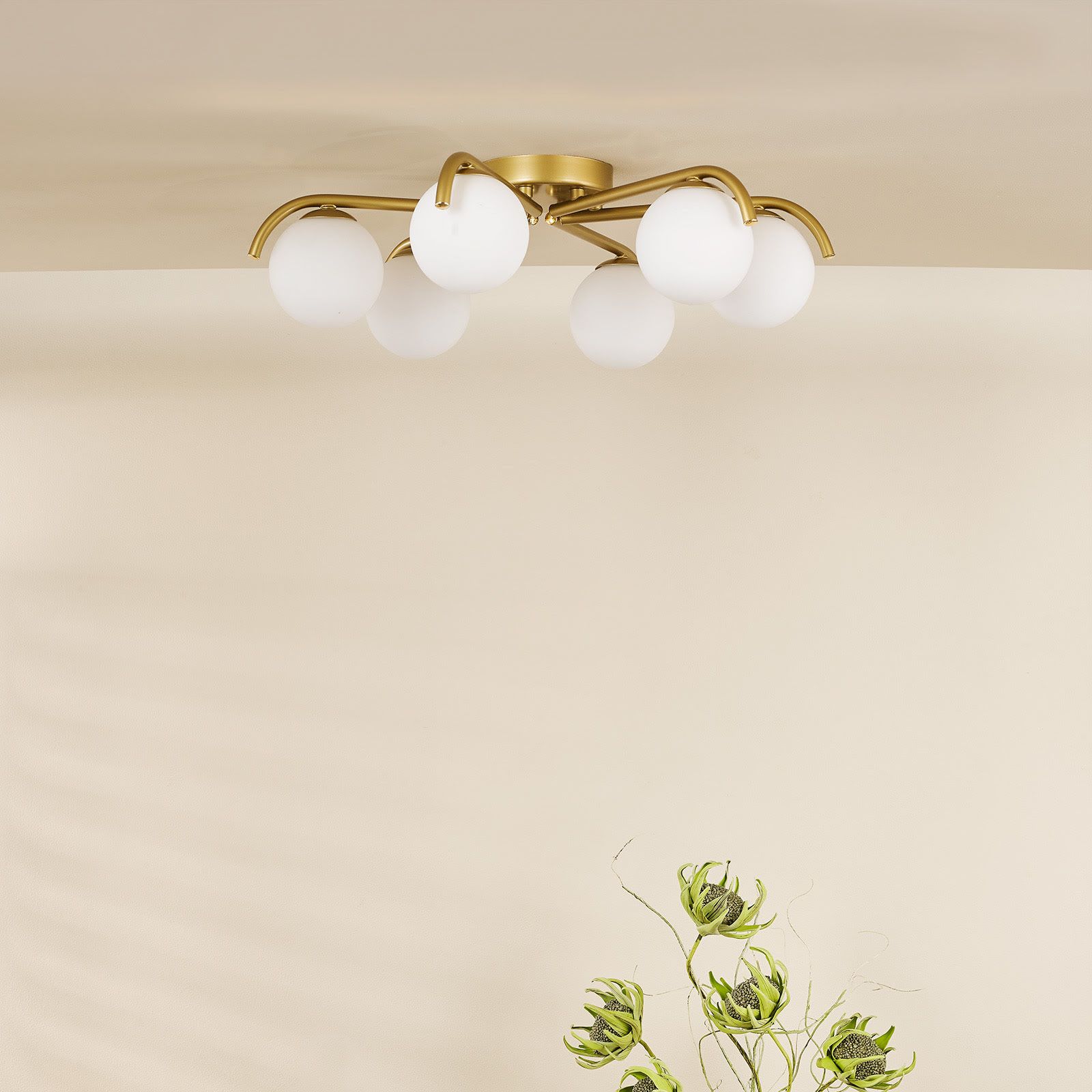 The modern curved arm 6 light flush satin gold ceiling light combines simplicity with elegant design, making it perfect for homes with lower ceilings. Its satin gold frame holds six white opal glass globes, diffusing a warm, even light across the room. Compact yet striking, this flush design works beautifully in bedrooms, living rooms, dining areas or hallways where a modern touch with generous illumination is needed. With its graceful curves and understated finish, it brings contemporary sophistication and effortless style to everyday spaces.