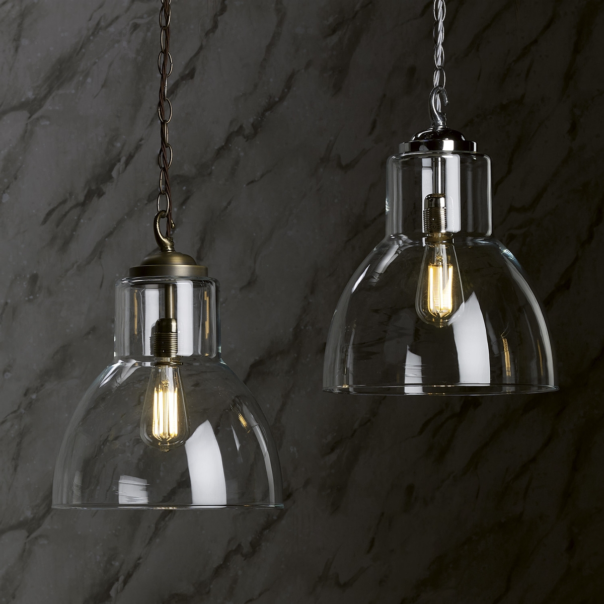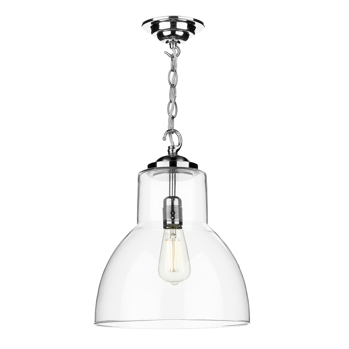A modern uptown large glass ceiling pendant antique brass or polished chrome .A single light ceiling pendant featuring a circular ceiling rose and decorative chain with hook details in a polished chrome finish or antique brass, complete with a glass shade. This British-made design has authenticity in its design with the combination of its clear glass shade and vintage style lamp which will provide any modern or traditional space with stunning illumination. Either placed alone or in a group over a kitchen island or dining table this stylish pendant is sure to make an interesting and eye-catching light display. This fitting is made to order so may take 7-10 days for delivery. As each of these fittings are hand made they are ineligible for return. Height is adjustable prior to installation.