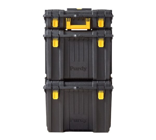 The Purdy Painter’s Storage Box. It’s the first storage system built specifically for Professional Painters. Designed by Pros for Pros, the Purdy® Painter’s Storage Box is packed with features that make it easy for Pros to organize, stow and go, transporting all their painting tools at once, so they’re job site ready. Extension pole holders, replaceable, all-terrain 9” wheels, an IP65 rating for water and dust resistance, plus Purdy quality from top to bottom, make the Painter’s Storage Box not only the first, but the ultimate storage system designed for Professional painters. Plus, it comes with 2 XL boxes, brush storage bars, and a wet brush and roller cover bin to keep you organized on every job.