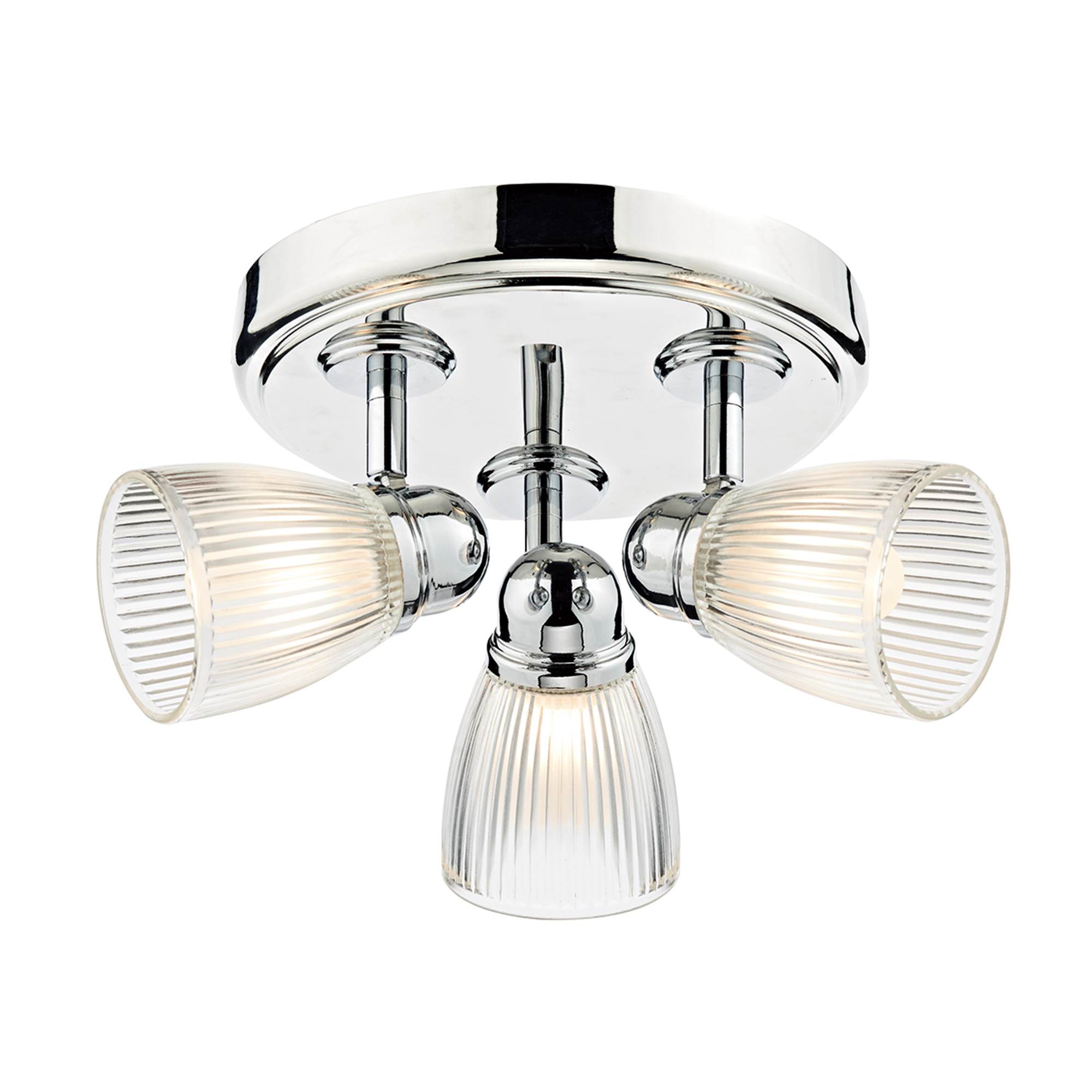 three light bathroom ceiling spot light with rippled glass – polished chrome – Compact IP44 polished chrome ceiling plate with 3 adjustable heads and ribbed glass shade giving a period feel to this fitting. Recommended for use on ceilings.