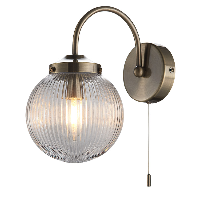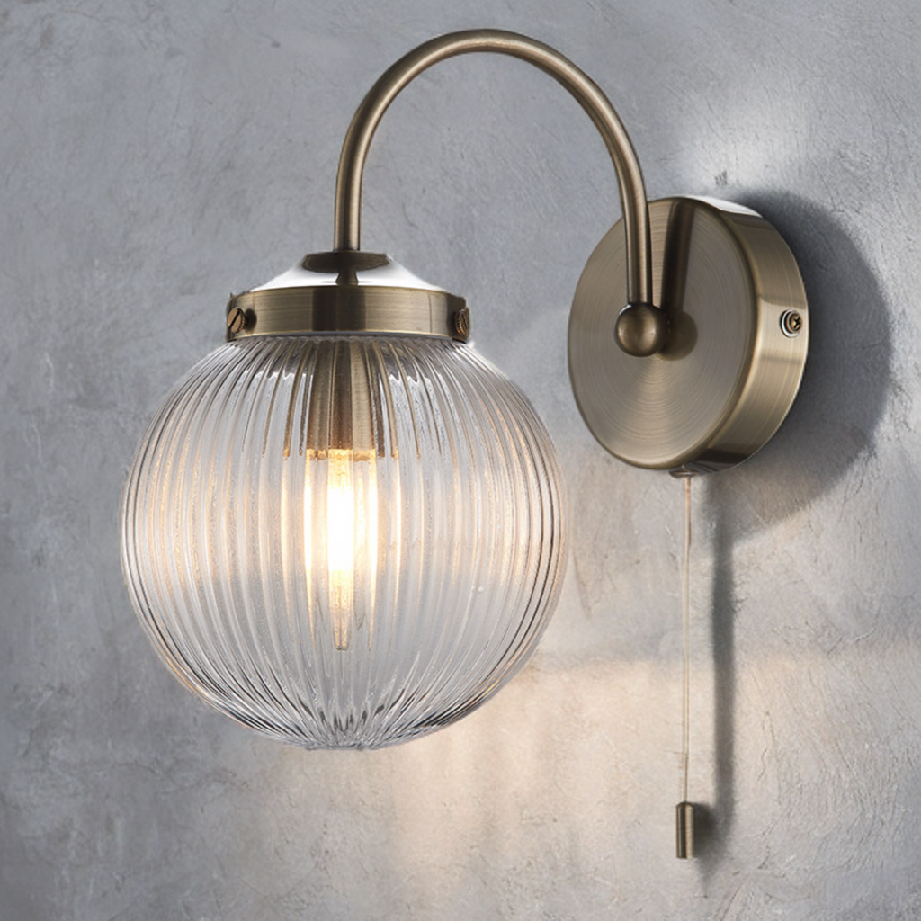Bring timeless charm and soft elegance to your space with this vintage-inspired bathroom wall light, featuring a warm antique brass finish and a ribbed glass globe shade.